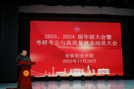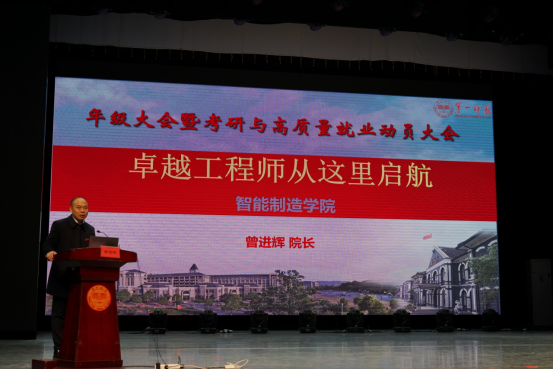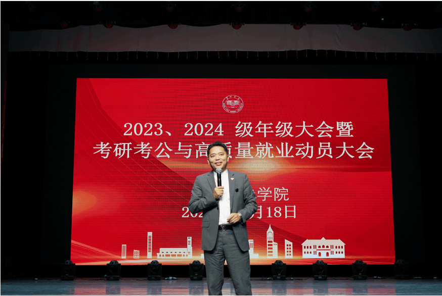为提高人才培养质量,明晰学生升学就业方向,11月18日晚19:00,我院2023、2024级年级大会暨考研考公与高质量就业动员大会在东方红校区田汉剧场举行。本次大会由学院院长曾进辉、启航考研负责人肖熙哲、考德上董事长田亚东、国防科技大学博士生詹礼新、2023级学生代表叶健海主讲,院长曾进辉、院党委书记田祖伟、副院长蔡颂、副院长马俊杰出席会议。学工办全体老师、系主任、双创中心主任、考研及电网班负责人、学院2023和2024级全体学生参加会议。会议由院党委书记田祖伟主持。