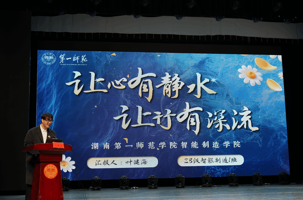 2023 级学生代表叶健海作学习与发展经验分享。他谈到,优异的学业成绩源于日复一日的坚持与高效的学习方法,同时,不局限于课堂,而是通过积极参与各类活动主动拓宽视野。他鼓励同学们既要脚踏实地,也要仰望星空,在实践中不断绘制属于自己的发展蓝图。