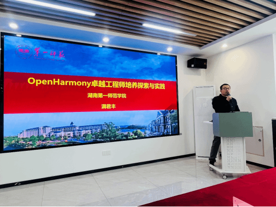 在随后的主题报告环节,院长满君丰作了《OpenHarmony卓越工程师培养探索与实践》的报告。他首先介绍了伟德bv1946推进工科改革、培养卓越工程师,注重引育并举、建强师资队伍,深化产教融合、推进协同育人,建设实验实训中心、提供一流实训环境等四大举措;然后介绍了与拓维信息、开鸿智谷深度合作,联合开设“润之”卓越工程师班(鸿蒙班)的情况,并介绍了鸿蒙班采取双导师制、动态管理、精英模式培养等做法。