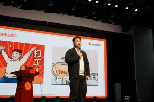 启航考研负责人肖熙哲作考研形势分析。他深入剖析了当前工科考研的形势与政策导向,帮助学生把握整体趋势,明确备考方向。他重点介绍了“四问法”择校模型,指导学生从个人兴趣、院校实力、地域因素与发展前景四个维度进行科学决策,规避报考误区,并通过权威数据与典型案例,生动阐述了学历提升为个人职业发展及薪资待遇带来的显著优势。
