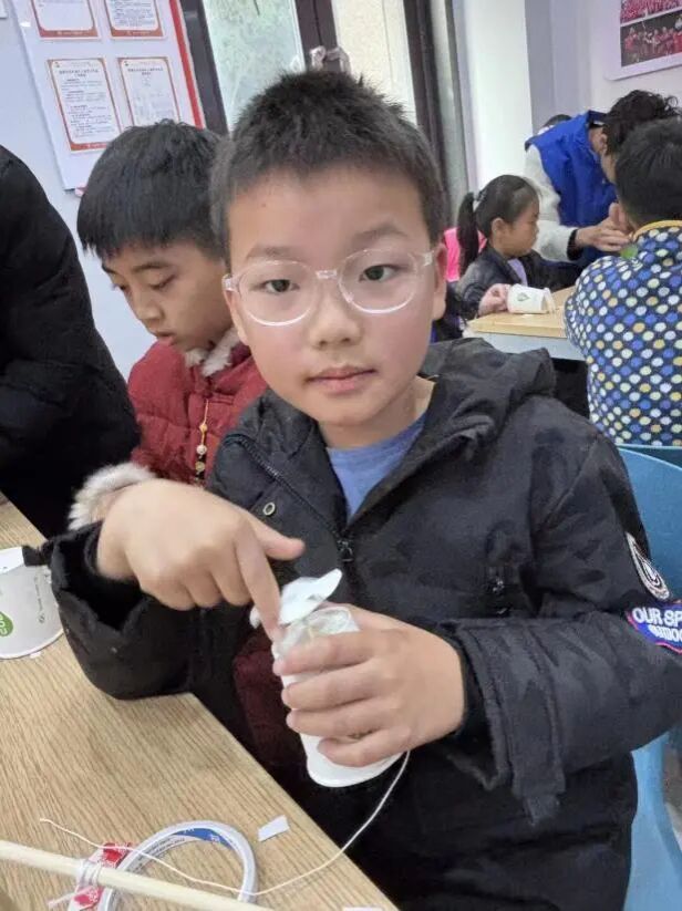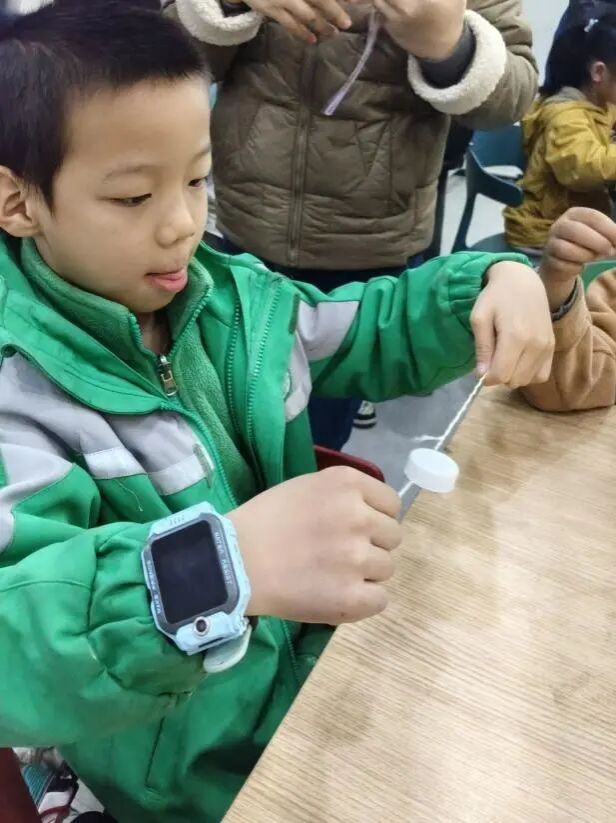简单的瓶盖与绳子,在孩子们手中变成了飞舞的魔法轮。快速旋转后轻轻一拉,飞轮竟能自动回转!“原来这就是惯性在坚持原来的转动!”孩子们在动手组装与试验中,第一次直观感受到惯性那股“不愿停下来”的力量。
