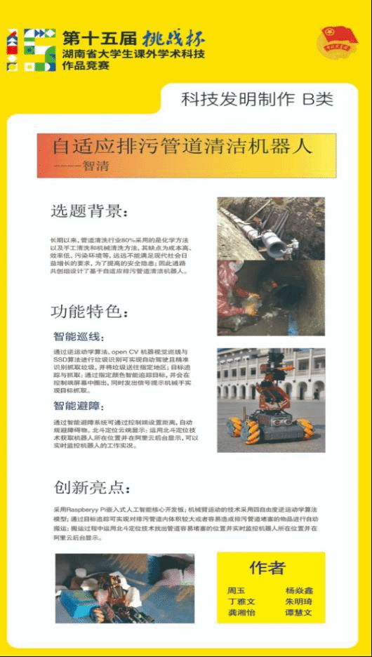 以挑战之名,逐青春之梦。5月22日,第十五届“挑战杯”湖南省大学生课外学术科技作品竞赛终审发布会在长沙理工大学云塘校区举行。我校在本届竞赛中荣获5个二等奖、4个三等奖,同时获得“优秀组织奖”。我院文跃兵老师指导的《智清——自适应排污管道清洁机器人》项目获二等奖。